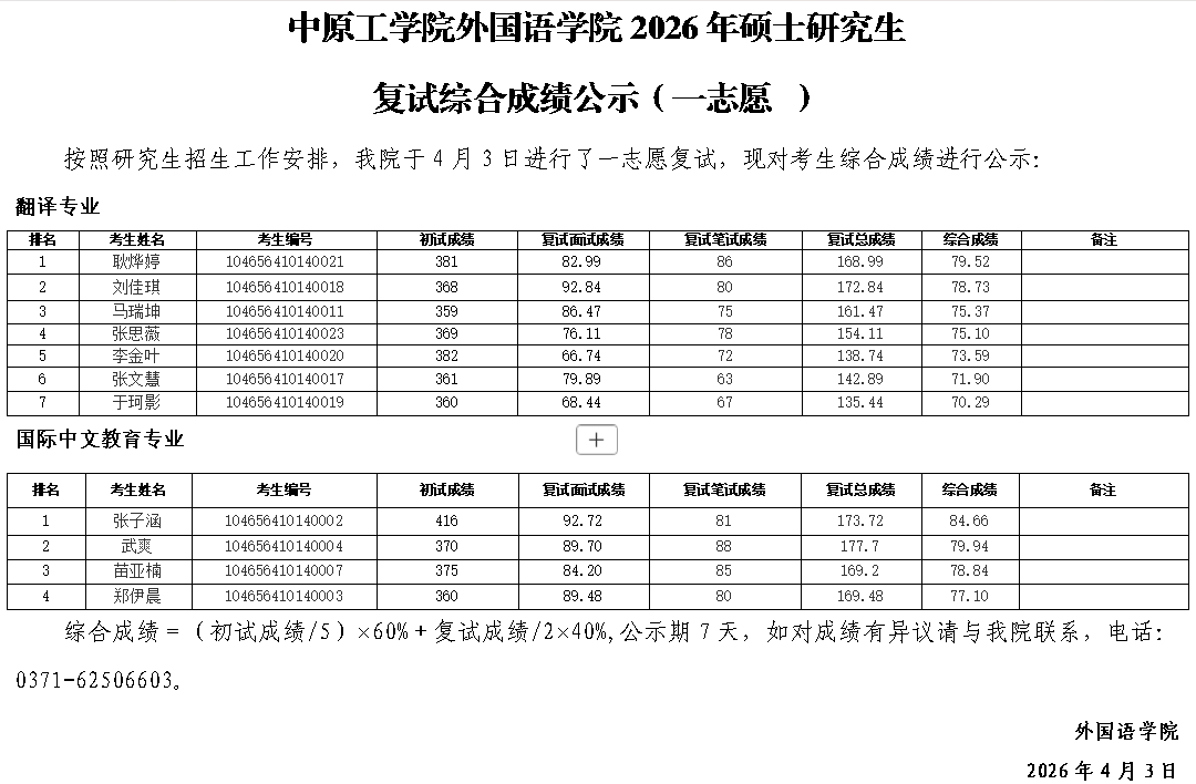 太阳集团tyc59972026年硕士研究生 复试综合成绩公示(一志愿 )